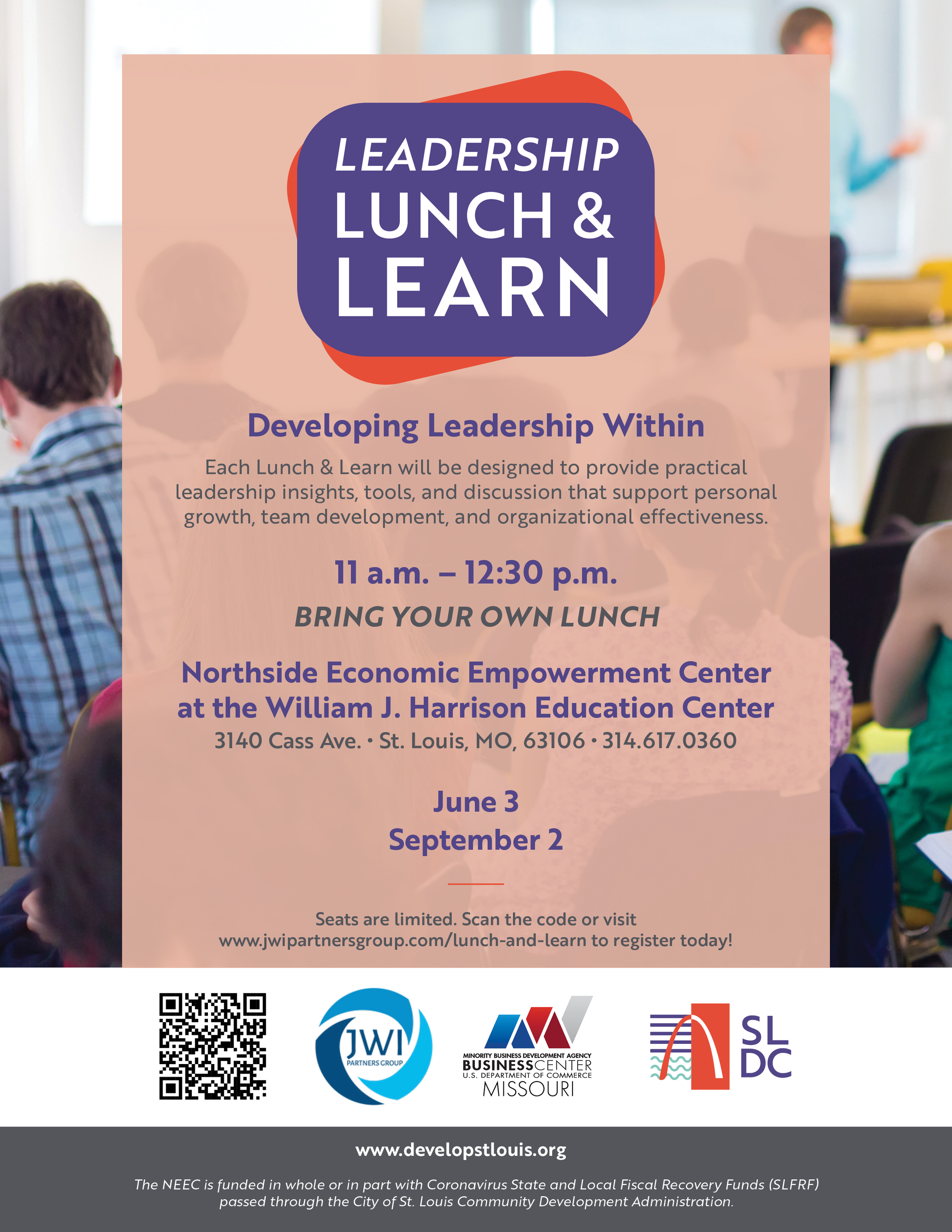 Leadership Lunch & Learn with JWI Partners Group Wednesday, June 3, 2026 11:00 AM 12:30 PM NEEC at the William J. Harrison Education Center 3140 Cass Avenue St. Louis, MO, 63106 United States (map) Google Calendar ICS Developing Leadership WithinEach Lunch & Learn will be designed to provide practical leadership insights, tools, and discussion that support personal growth, team development, and organizational effectiveness. Register Here