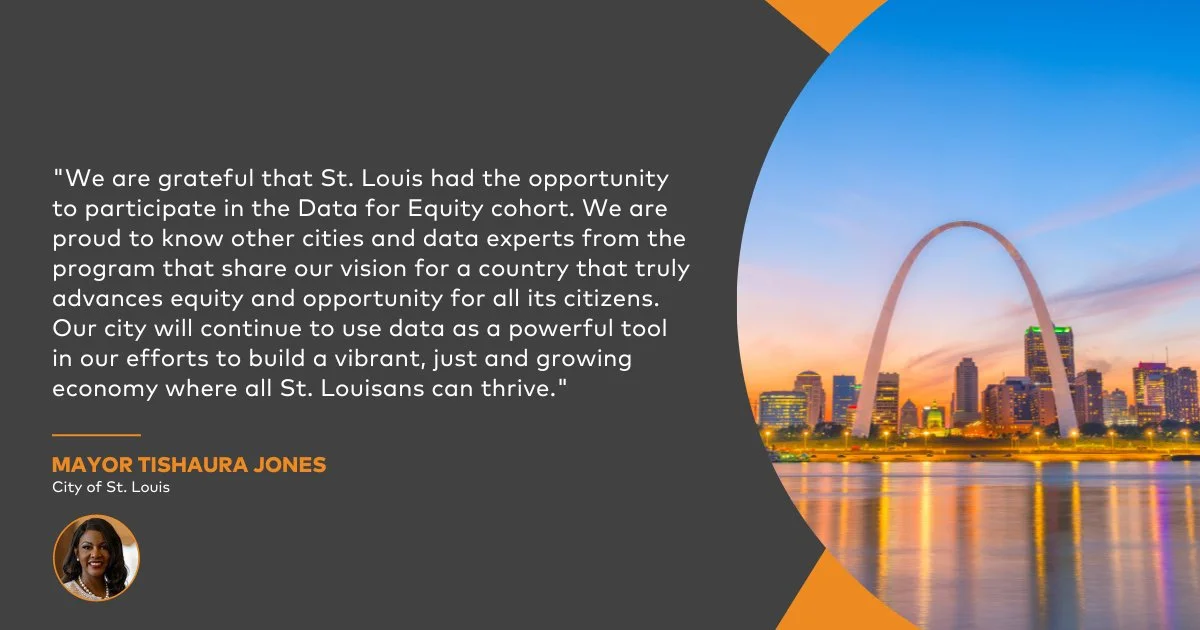 Data for Equity created an open learning environment that supported city leaders in leveraging data tools and dashboards to drive outcomes that matter to their residents, focusing on racial equity and closing wealth and opportunity gaps. St. Louis participated alongside Atlanta, Georgia; Baltimore, Maryland; Birmingham, Alabama; Dayton, Ohio; Louisville, Kentucky and Salt Lake City, Utah.